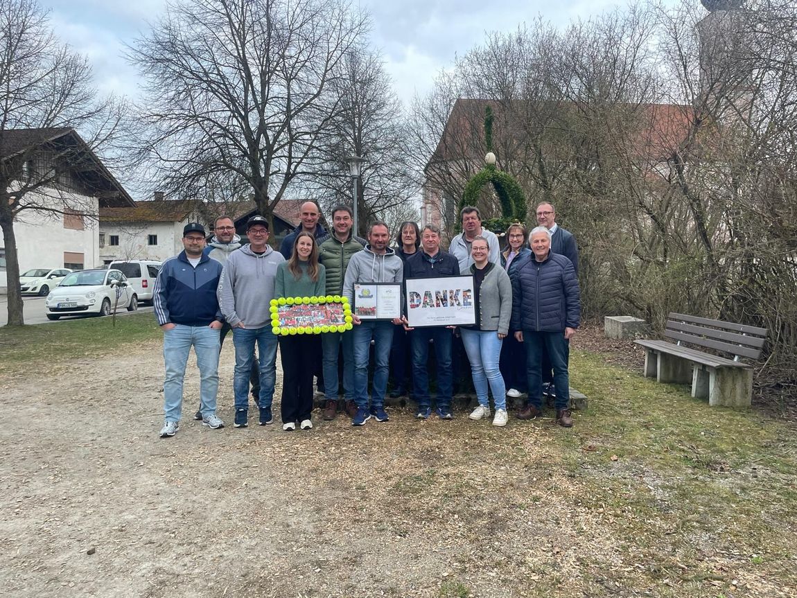 Vorstandschaft Tennisverein, Mitte: ausgeschiedener Vorstand Josef Hüttner und neuer Vorstand Robert Huber mit Präsenten, Tobias Dorenz 2. Vorstand und Sportwart, Renate Hüttner Kassier, Sebastian Braun Schriftführer, Sabrina Ehgartner 1. Jugendwartin, Andreas Frank und Wolfgang Rembeck Jugendwarte, Beisitzer: Christine und Sigi Fußeder, Alexander Filpe, Sebastian Rundbuchner, Anna Ritthaler
